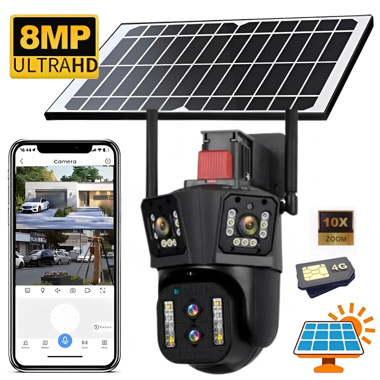 The Camera 4G Solaire Double Camera Zoom X10 offers high-definition video with powerful 10x zoom for detailed monitoring.