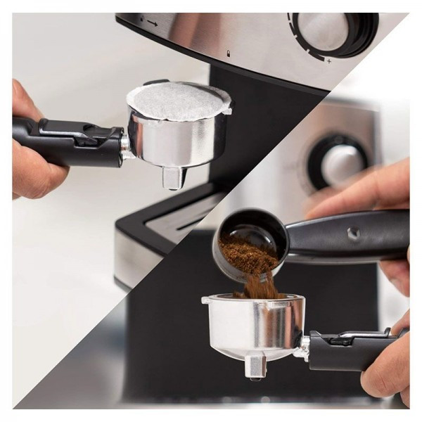 Machine à Café Expresso UFESA - Puissance: 850 Watts - Pression: 20 Bars - Capacité du réservoir d'eau: 1.6 Litres - Nombre de tasse: 2 - Double option de préparation de café: Café moulu traditionnel ou système de dosettes de café - Porte-filtre métallique - Filtre papier spécial pour dosettes de café - Buse vapeur réglable pour faire mousser le lait - Boutons avec voyants: café + on/off, sélecteur café/eau chaude et vapeur + interrupteur - Bac d'égouttage amovible pour un meilleur nettoyage - Couleur: Inox - Garantie: 1 an