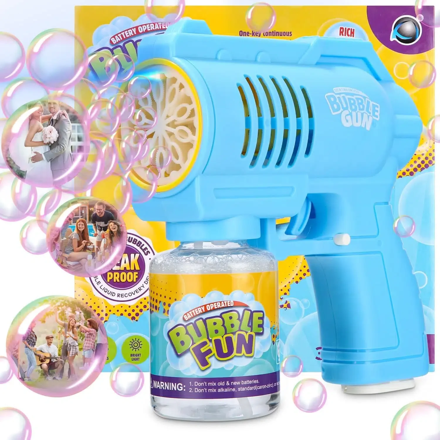• DESIGN SANS FUITE À 360°: Le pistolet à bulles a un design anti-fuite à 360°, après l’installation de la bouteille de recharge de bulles, que vous la mettiez à l’avant ou à l’envers