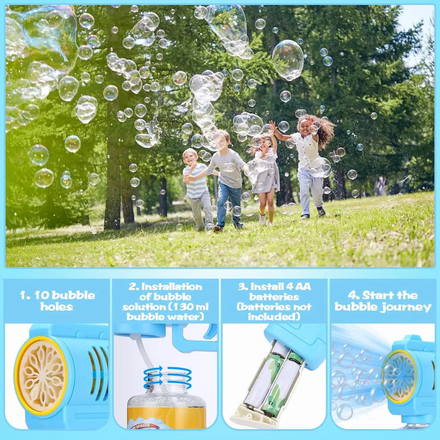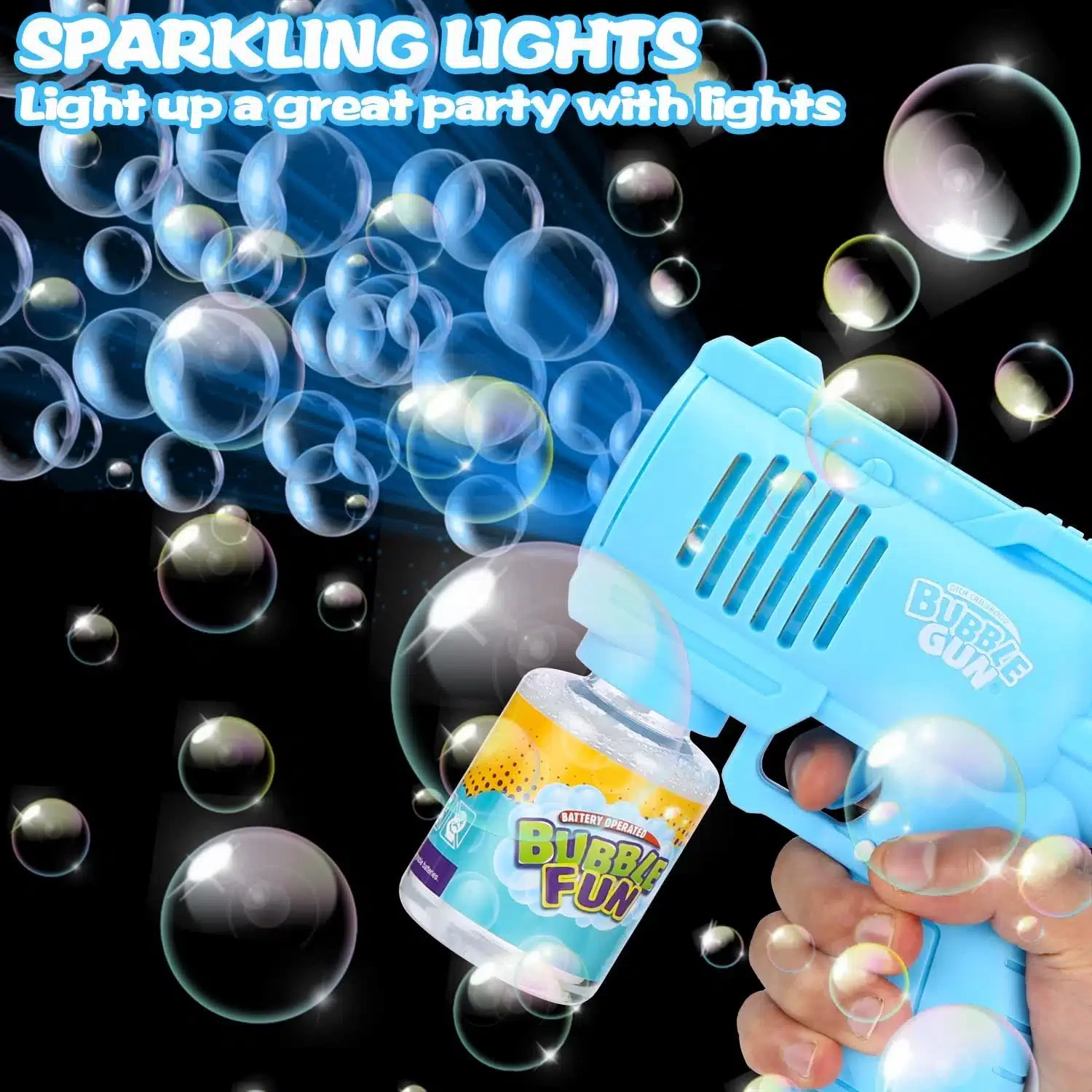 • KIDS BUBBLE GUN : Avec 10 trous de barre de pulvérisation améliorés et une forte force du vent, le pistolet à bulles produit automatiquement plus de 10.000 bulles de savon colorées par minute