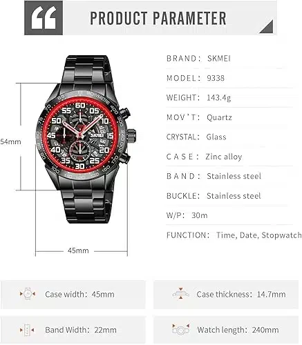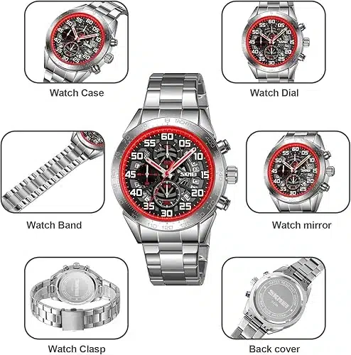 Design élégant : Son grand cadran aux index rouges attrayants affiche un style personnalisé, adapté à diverses occasions et mettant en valeur un sens de la mode unique.