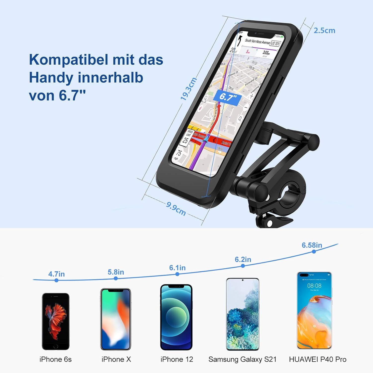 • Le support de vélo universel est compatible avec les appareils GPS jusqu’à 6,7 pouces. iPhone 12 Pro Max, 11 Pro, Pro Max Xs XR X8 7 7s 6s 6 Plus, Huawei P30 Pro 10 Pro, Samsung Galaxy, Note, LG, HTC, Sony, Nokia, Nexus